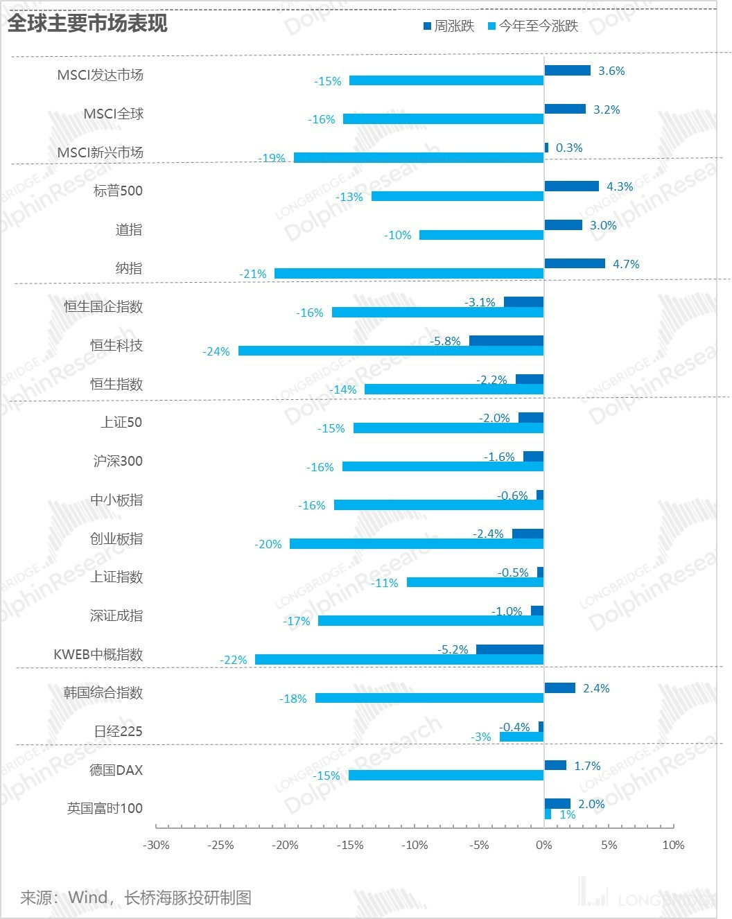 海豚君就先围绕上周主要市场涨跌情况来说:在加息、衰退的大背景下,美股反而一枝独秀,一周涨幅 3-5%,基本称得上是暴力反弹;而解封了两个月后,A 股则是一言难尽,中概更是扶不起来。