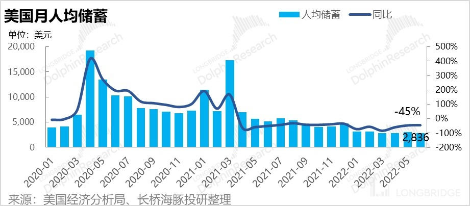 看上周更新的美国人均储蓄数字:美国人看起来本来就没啥储蓄习惯,人均储蓄只有几千美元,6 月最新的人均储蓄进一步缩水到了 2800 美元,而且这个同比降幅 45%,堪比国内的房屋销售降幅。