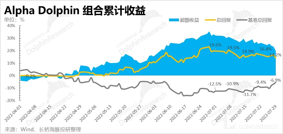 整体由于中国资产回调幅度持续较大、海豚君中国资产仓位较重,上周(7/25-7/29)海豚投研 Alpha Dolphin 组合收益下跌了 2.2,明显跑输标普 500 指数(上涨 4.3%,以原油价格稳住为准,标普修复有一个月整),同时稍低于沪深 300 跌幅(-1.6%)。