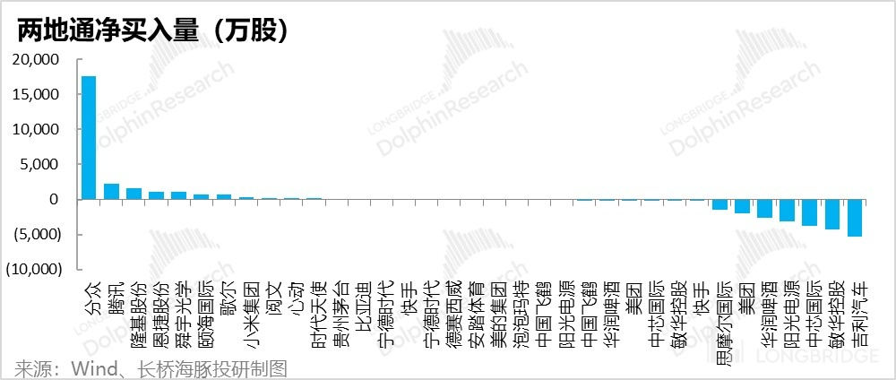 上周在海豚君关注股票的资金流向上:北上资金持续连续数周买入分众,另外消费电子股如舜宇和歌尔,在苹果出财报之际,开始出现净买入,新能源中的隆基股份和恩捷也在被资金净买入。买入靠前的当中,重点要提的是腾讯,在 300 元附近南下资金已经开始加大了买入腾讯的幅度。