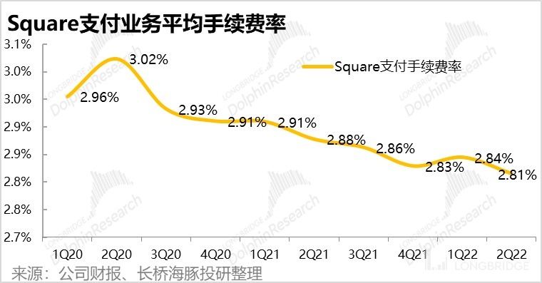 由于 Square 支付手续收入增速低于 GPV 增长,可以推断支付手续费率有所下行。经海豚君推算,本季度支付业务平均手续费率继续下滑到 2.81%,处于持续下行周期中。不过这也符合海豚君先前的判断:随着公司服务的中大型商家增长,支付手续费率会持续下降。