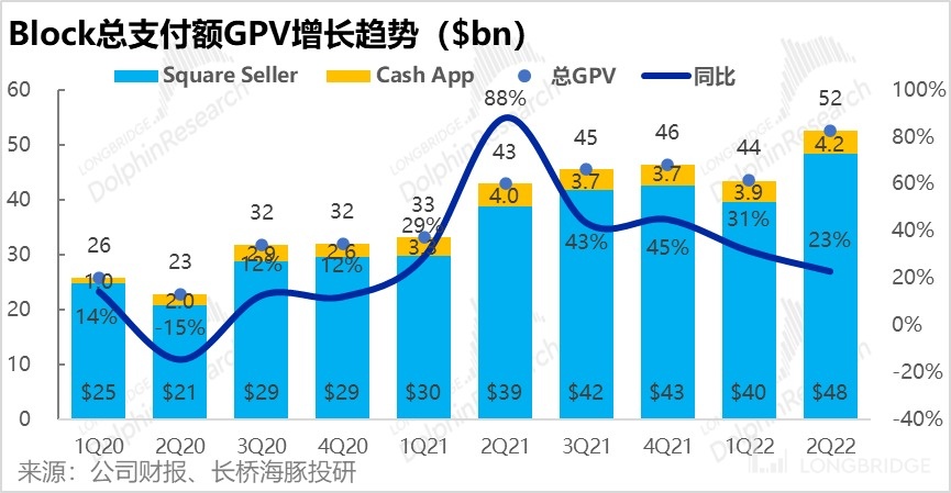 在经营数据方面,Square 商家完成的支付金额 (GPV) 为 480 亿,同比增长 24%。加上通过 Cash App 完成的 C2B 支付额,总 GPV 为 520 亿美元,略低于市场预期的 530。海豚认为不及预期的原因主要是 Cash App 的 B2C GPV 增长明显放缓。