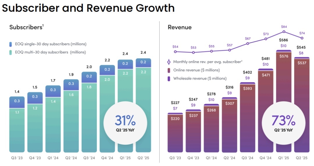 核心业绩:公司二季度营收 5.448 亿美元,但低于 5.517 亿美元的市场预期,同比增长 73%,环比下降 7%。调整后每股收益 0.17 美元(预期 0.15 美元),调整后 EBITDA 达 8220 万美元(去年同期 3930 万美元),实现翻倍增长。2025 年第二季度的毛利率为 76%,而 2024 年第二季度为 81%。