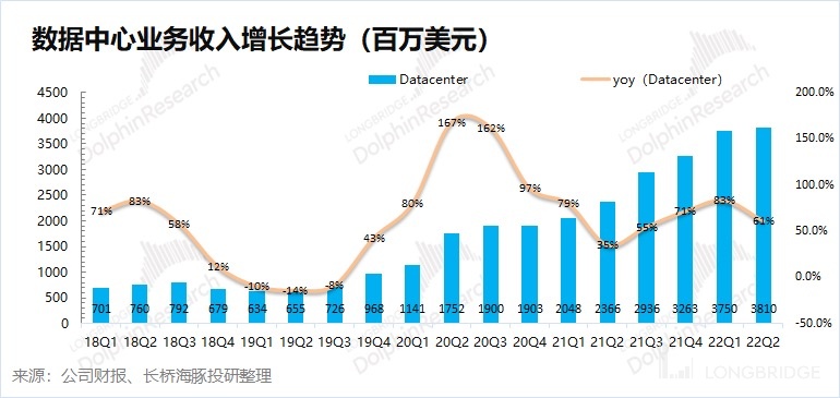 2.2 数据中心业务:2023 财年第二季度英伟达的希望之星——数据中心业务实现营收 38.1 亿美元,同比增长非常唬人,高达增长 61%,但环比上已经能看到后劲不足,因为只增了 1%。虽然本季度英伟达的业绩主要是被游戏业务拖垮,但也不能忽视存在增长隐患的数据中心业务。
