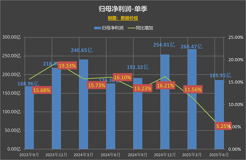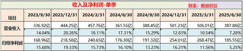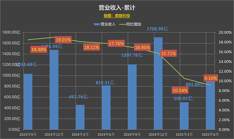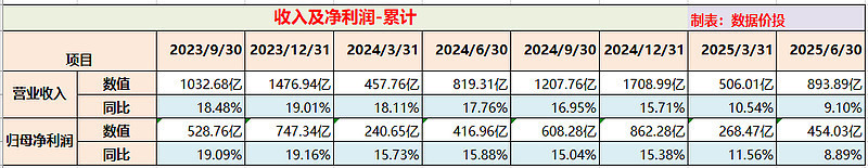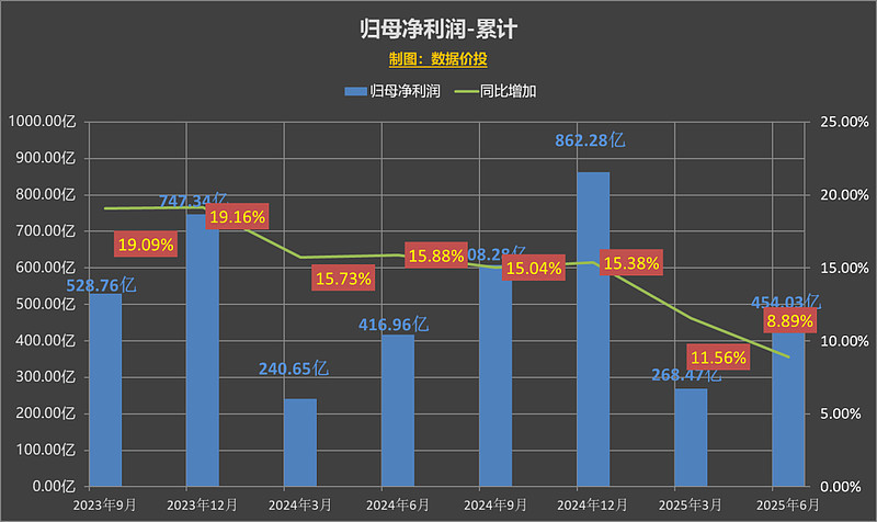 上半年营业收入为 893.89 亿,同比增9.10%,相比年初时制定的 9% 的年度目标稍稍超出,算是完成了既定任务;而上半年的归母净利润为 454.03 亿,同比增8.89%。