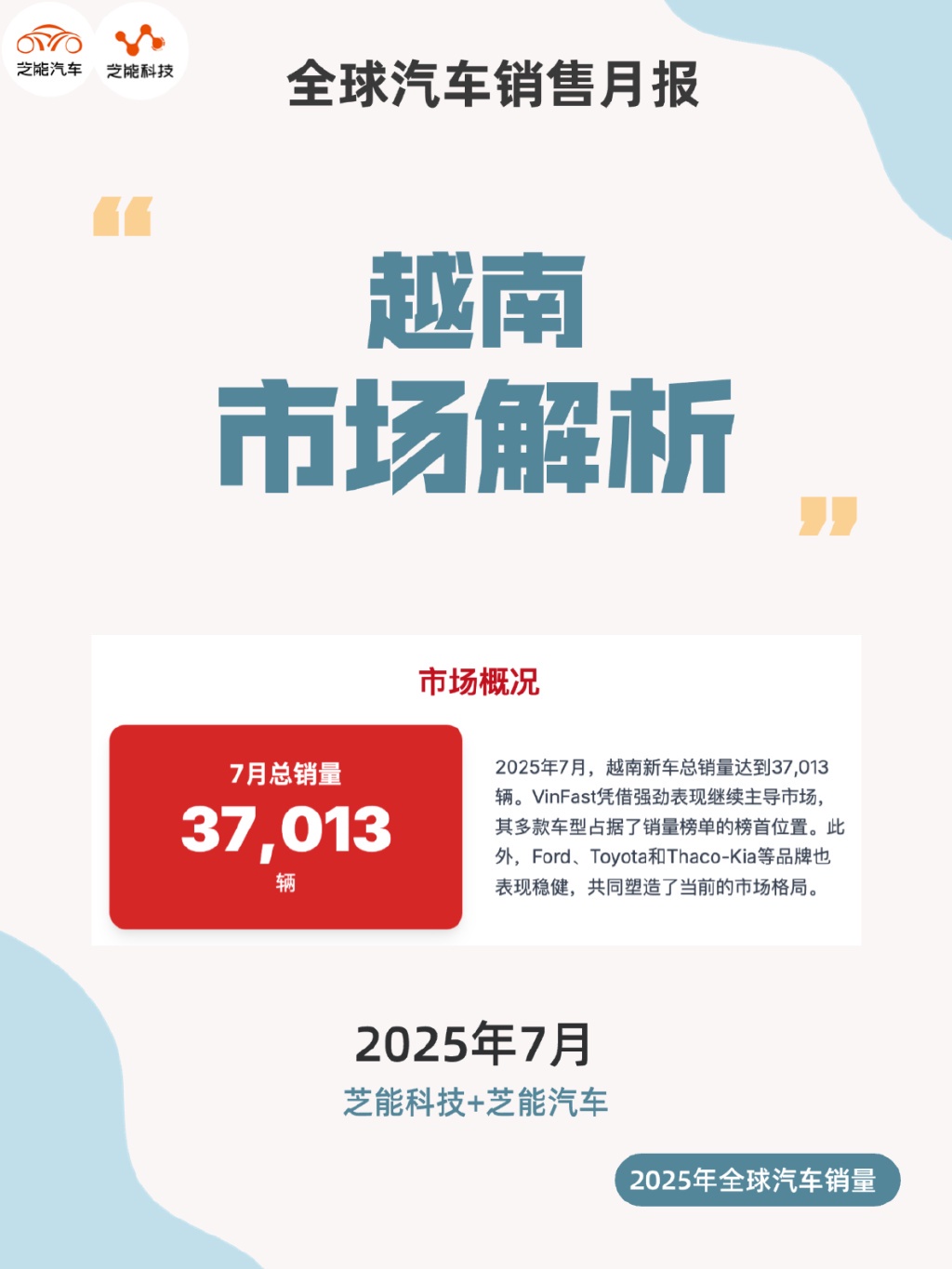7 月,越南汽车市场在本地车企协会和部分厂商公布的数据下,呈现出温和增长。整体销量达到 46,819 辆,同比增长 4%,累计销量则攀升至 301,603 辆,年内增幅超过 15%。