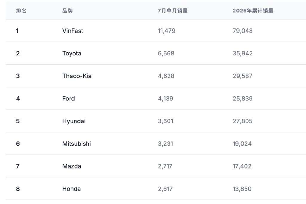 越南汽车市场过去二十年的核心逻辑是外资主导——丰田、现代、三菱和起亚构成主流选择,本土品牌更多是陪衬。但七月的成绩单说明,越南汽车的重心正在被本土厂商改写。