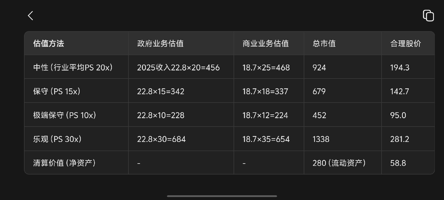 - 双引擎驱动:政府业务(55%)+ 商业业务(45%),2025 年 Q2 美国商业收入同比增 93%。