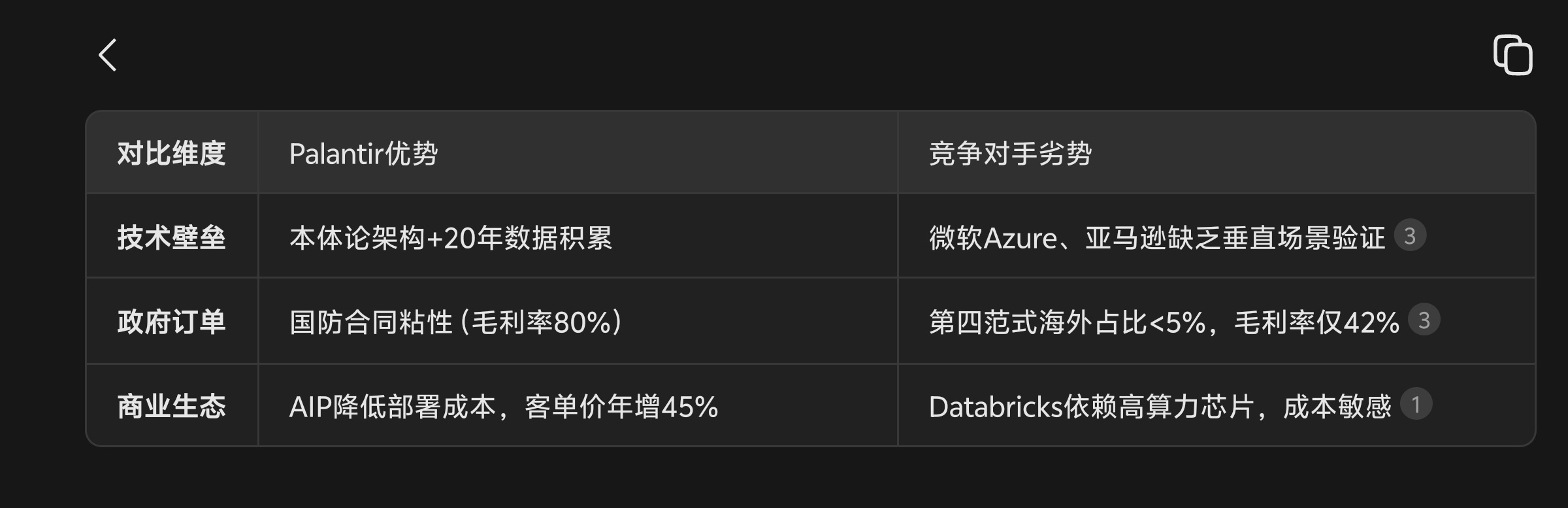 - 国防壁垒:垄断美军 AI 系统,合同金额超 100 亿美元(10 年期)。