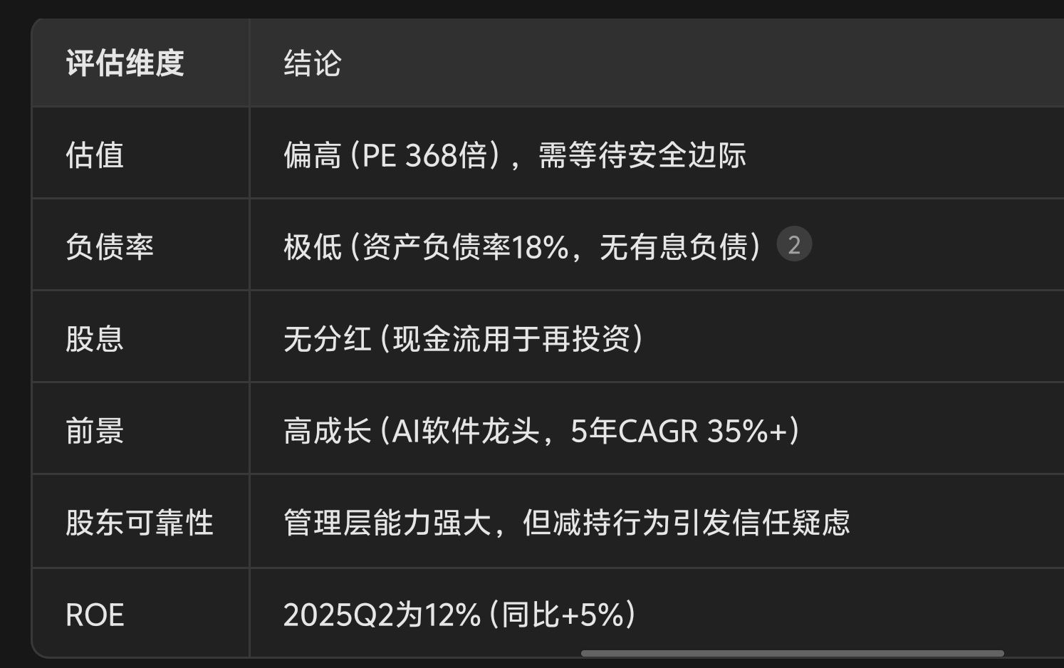 - 创始人团队稳定(CEO Alex Karp 任职 20 年),但 2025 年 5 月减持 1.15 亿美元股票引发争议。
