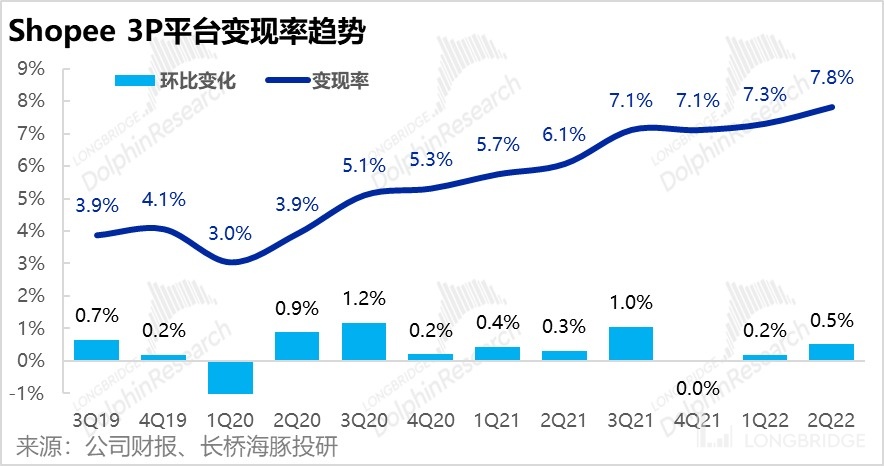 不过营收增速显著高于 GMV 增速,还是反映了公司为提升电商业务盈利能力,提高变现率的举措。经计算,本季度 Shopee 电商业务的变现率为 7.8%,环比再度增加了 50 个基点。