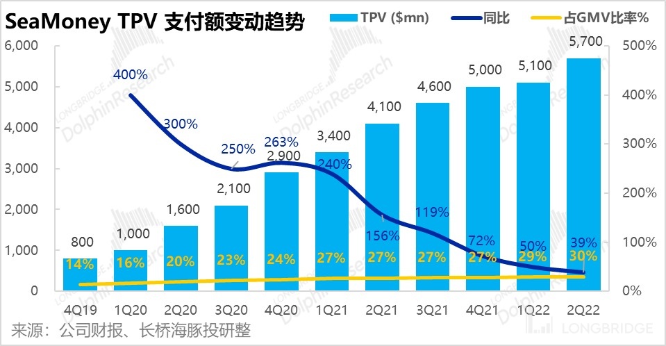 SEA 旗下的新兴板块 -- 数字金融业务,本季度实现平台内支付额(TPV)57 亿美元,同比增长 39%。虽看似增速放缓,但从营收环比净增额来看,本季度实际在加速成长。截至本季度末,SeaMoney 的用户数量已达 5270 万人,环比上季增加 370 万人。