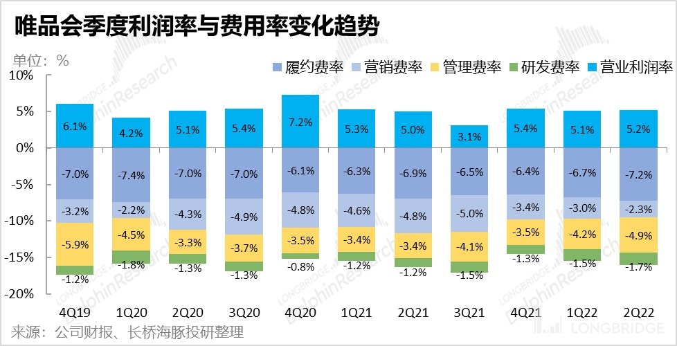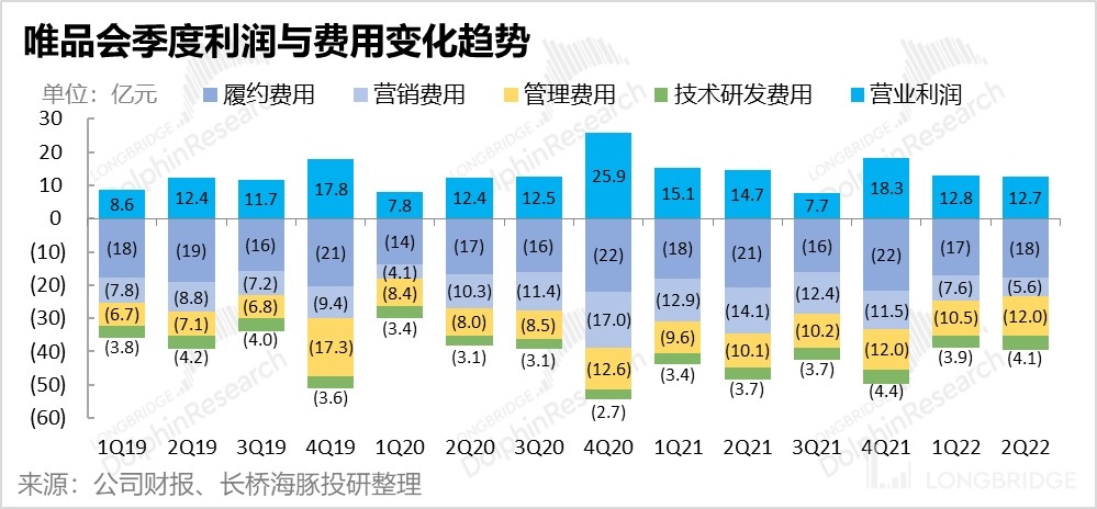 但是,在内部费用上,唯品会并未能良好控制开支,在营收萎缩的情况下,研发和管理费用的绝对值居然还在继续增长。其中管理费由 10.5 亿环比增加到 12 亿,研发费用由 3.9 亿增加到 4.1 亿。