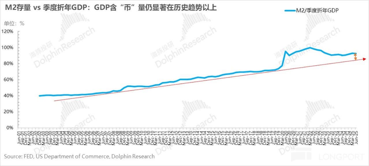 1)2008 年经济危机的放水救经济,美国政府救了之后,实际之后的很多年至少在努力尝试让 GDP 的含水量(用 M2/季度年化 GDP 来表示)回归到历史常规的水位上。