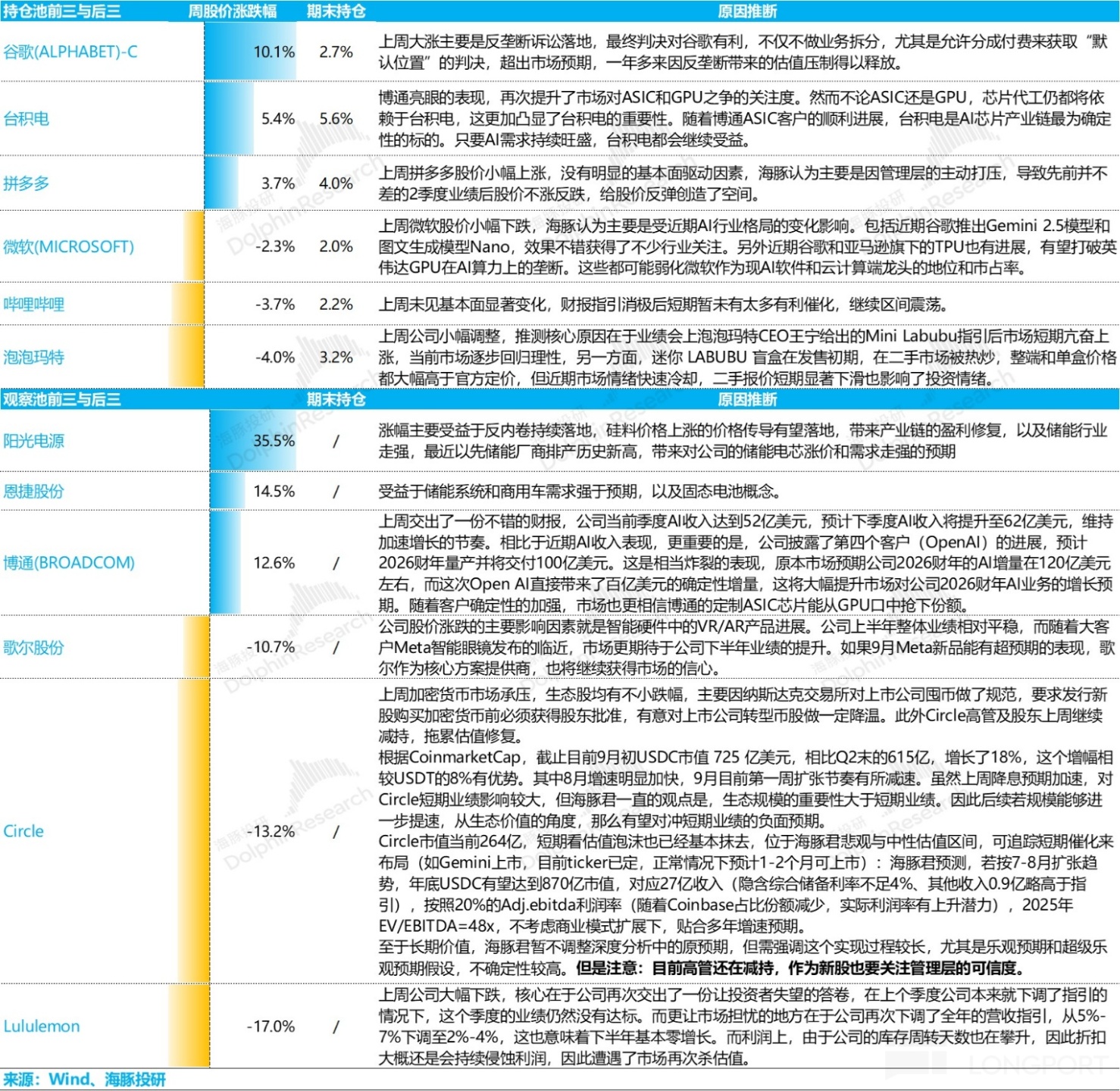 上周海豚君的虚拟组合 Alpha Dolphin 跑超市场指数,主要因组合持仓中重仓股台积电、拼多多,以及案件风险落地的谷歌。此外降息预期下黄金不断拉高也对指数有重要贡献。