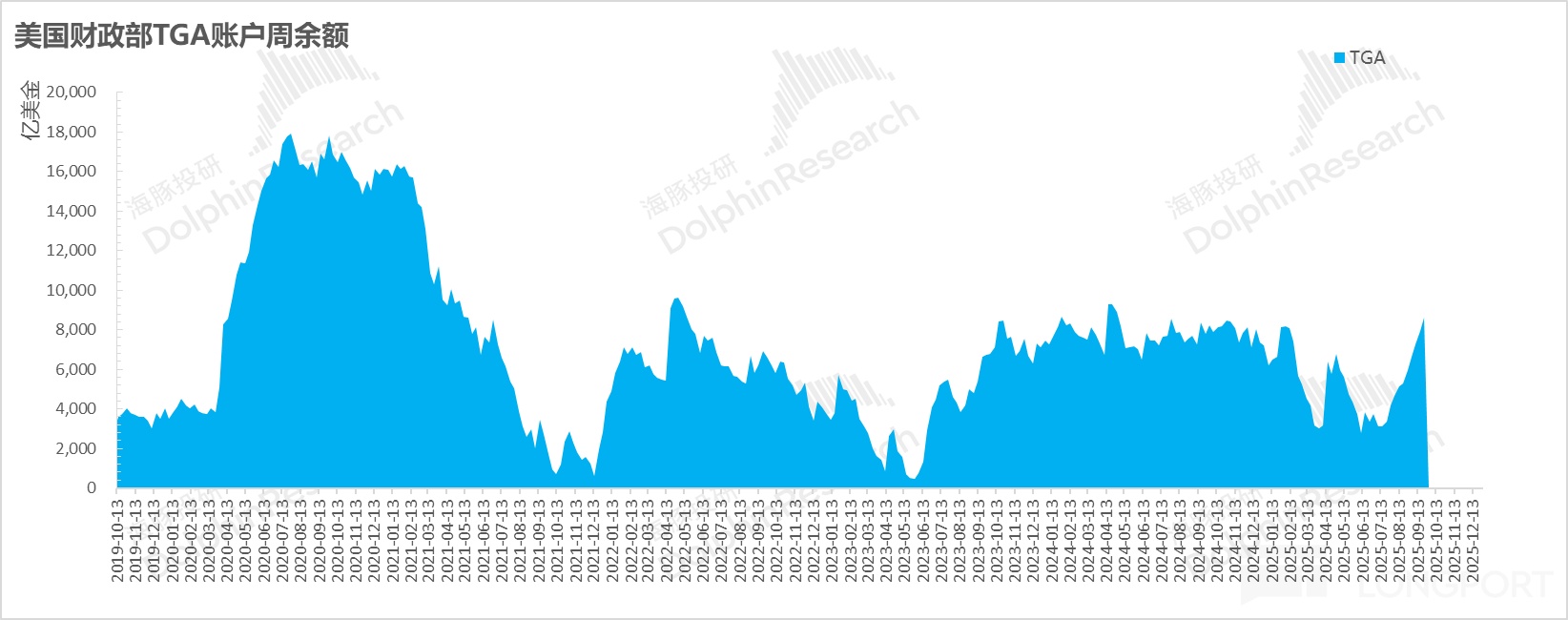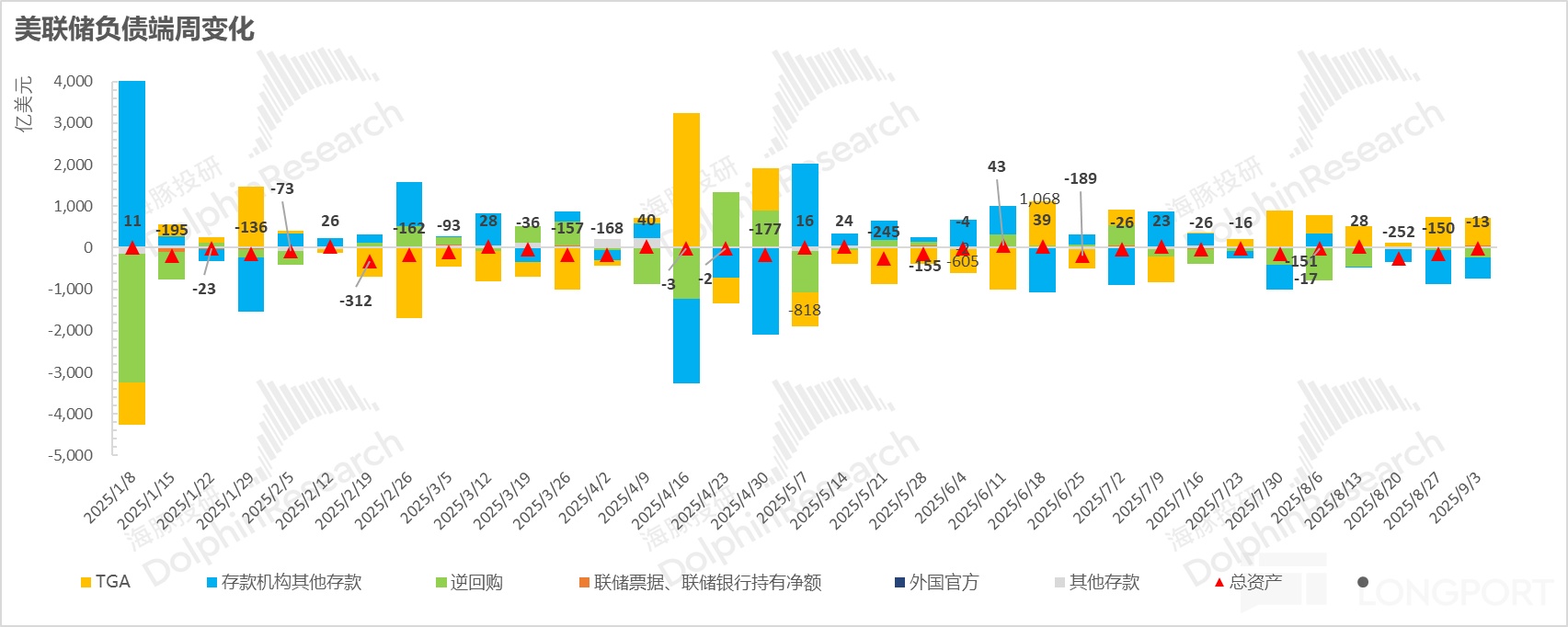 最近两周,财政部 TGA 账户余额明显加速重建,到 9 月 3 号周,已经有 6600 亿,按照每周这个速度的重建节奏,到 9 月底基本能够如期完成 8500 亿的目标。