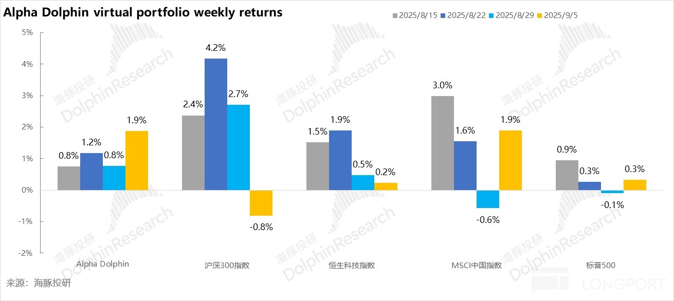 上周,海豚投研的虚拟组合 Alpha Dolphin 未调仓。当周上行 1.9%,跑平 MSCI 中国指数,跑赢恒生科技(+0.2%)、标普 500(+0.3%)、沪深 300(-0.8%)。