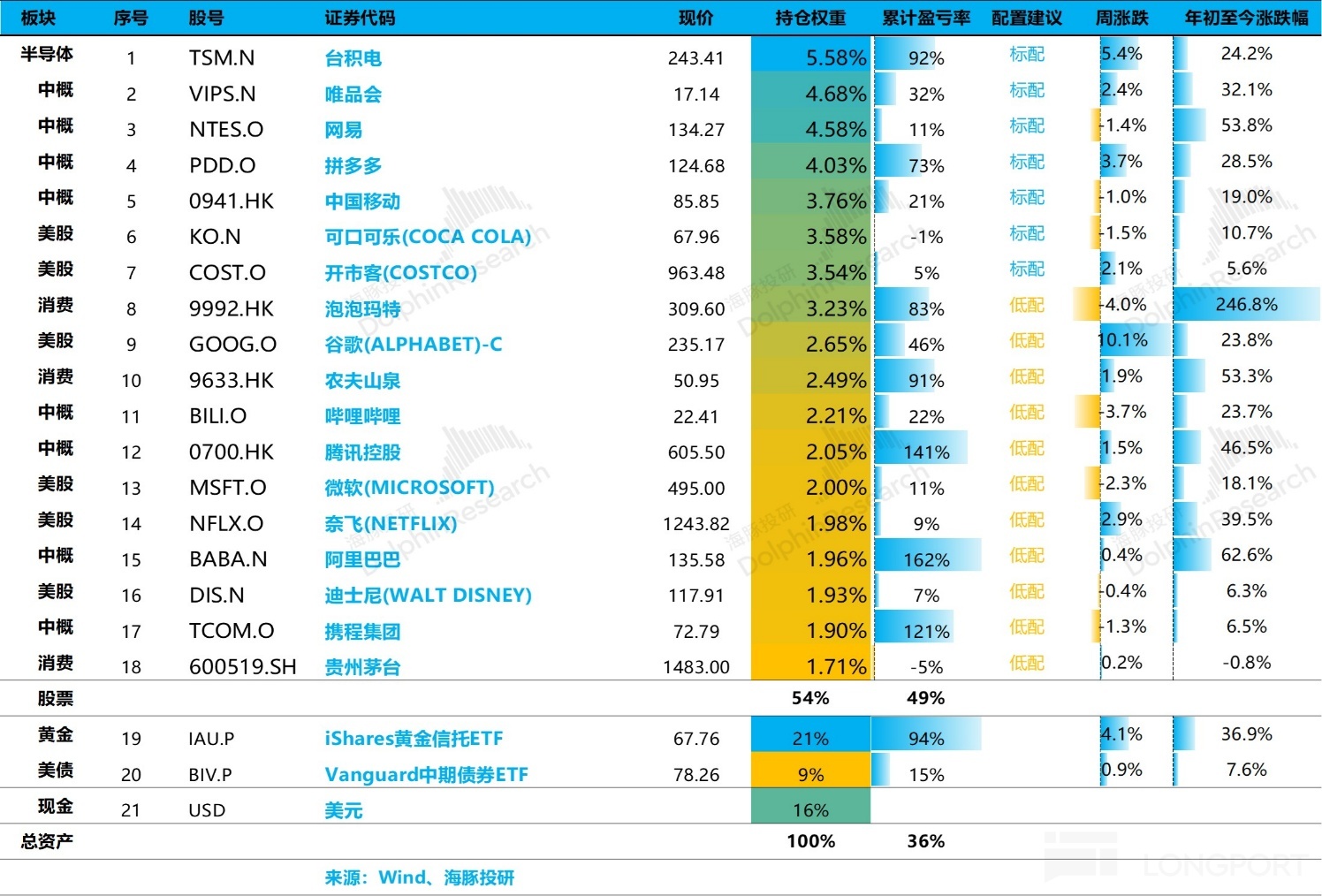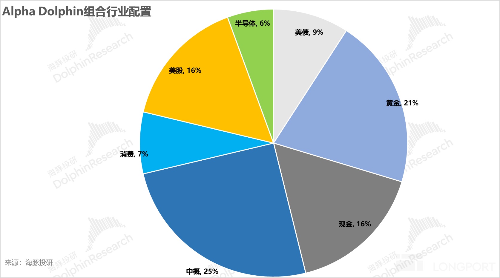Alpha Dolphin 虚拟组合共计持仓 18 只个股与权益型 ETF,其中标配 7 只,其余低配。股权之外资产主要分布在了黄金、美债和美元现金上,目前权益资产与黄金/美债/现金等防守资产之间大约 54:46。