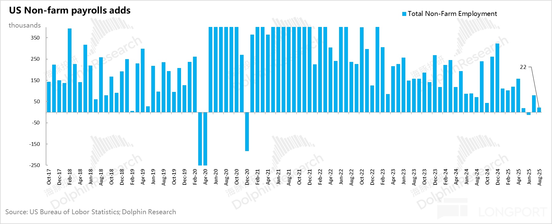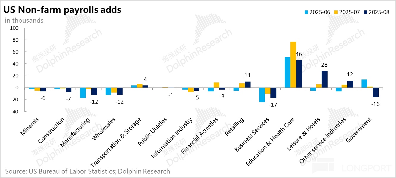 同时,从细分结构上来看:一个经济体,如果连续三个月,采矿、建筑、制造、批发、信息技术、公共服务等多个行业都在持续裁员,那经济大概率已经泥潭了,而美国最近三个月的就业数据就是这种景象。8 月正增长的主要只有零售服务(主要是日用品零售)、医疗健康行业和餐饮服务业。