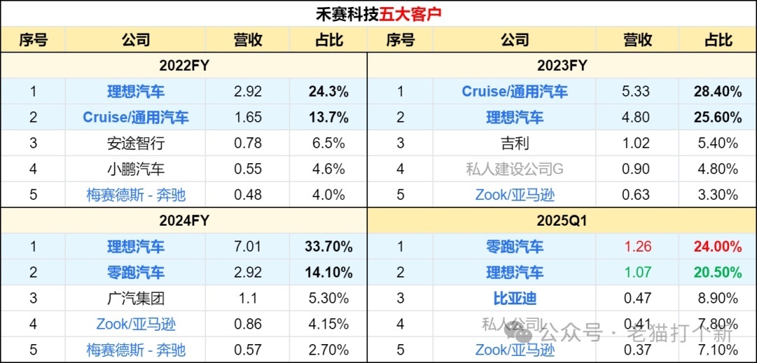 禾赛前五大客户变动如下,截至 2022 年、2023 年及 2024 年 12 月 31 日止各年度以及截至 2025 年 3 月 31 日止三个月,前五大客户的收入分别占总收入的 53.1%、67.5%、59.9% 及 68.3%。自 2024 年以后,通用汽车旗下的 Cruise 终止,零跑$零跑汽车(09863.HK) 、理想成为公司的主要客户。