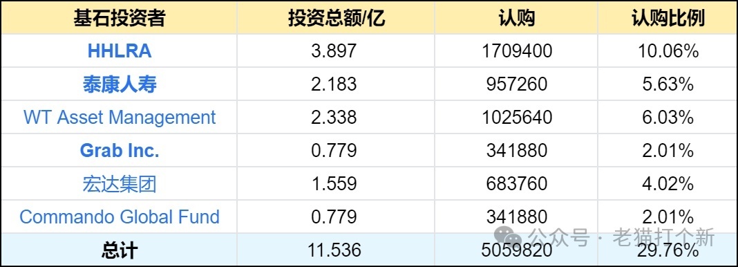 【基石】6 家,占比 29.76%。有高瓴、康泰人寿、Grab Inc.、WT Asset Management、宏达集团、Commando Global Fund等。