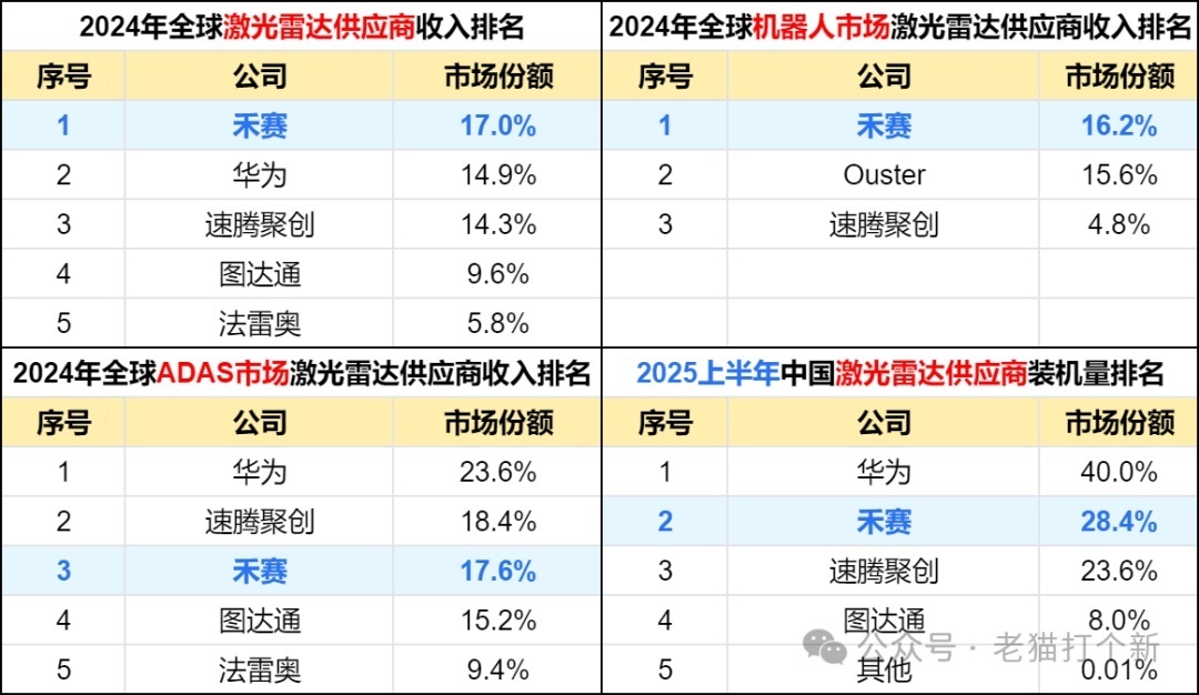 按收入计,公司于 2022 年、2023 年及 2024 年均为全球第一大激光雷达供应商。