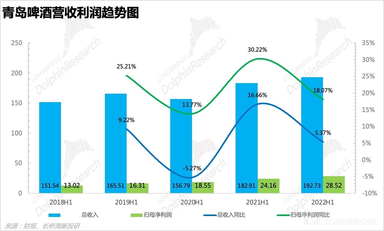1、营收表现比预期好:海豚君本以为在去年高基数和今年上半年疫情的影响下,青岛啤酒业绩会出现下滑,但实际的成绩单反而挺好,有点超预期,营收达到 192.73 亿元,同比增长 5.37%,主要原因是:1)疫情下导致消费场景缺失,但是居家消费有弥补,而且线上和社区团购渠道里的中高端产品居多,很大程度上促进了中高端产品的销量;2)21 年下半年提价后的红利在今年上半年集中体现,实现了每千升啤酒营业收入提高;3)3-4 月份受疫情影响严重,但是 5 月份开始疫情缓解,动销恢复很快。