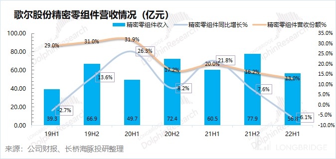 歌尔股份的精密零组件业务 2022 年上半年实现收入 56.8 亿元,同比下滑 6.1%。歌尔的精密零组件业务主要包括 MEMS、mic 等电子器件,其中最大的下游应用领域在手机方面。