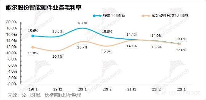 歌尔股份智能硬件业务 2022 年上半年毛利率实现 12.8%,同比下滑 1.3pct。在通胀的影响下,公司在制造环节受成本提升的压力较大,从而挤压公司的毛利率。