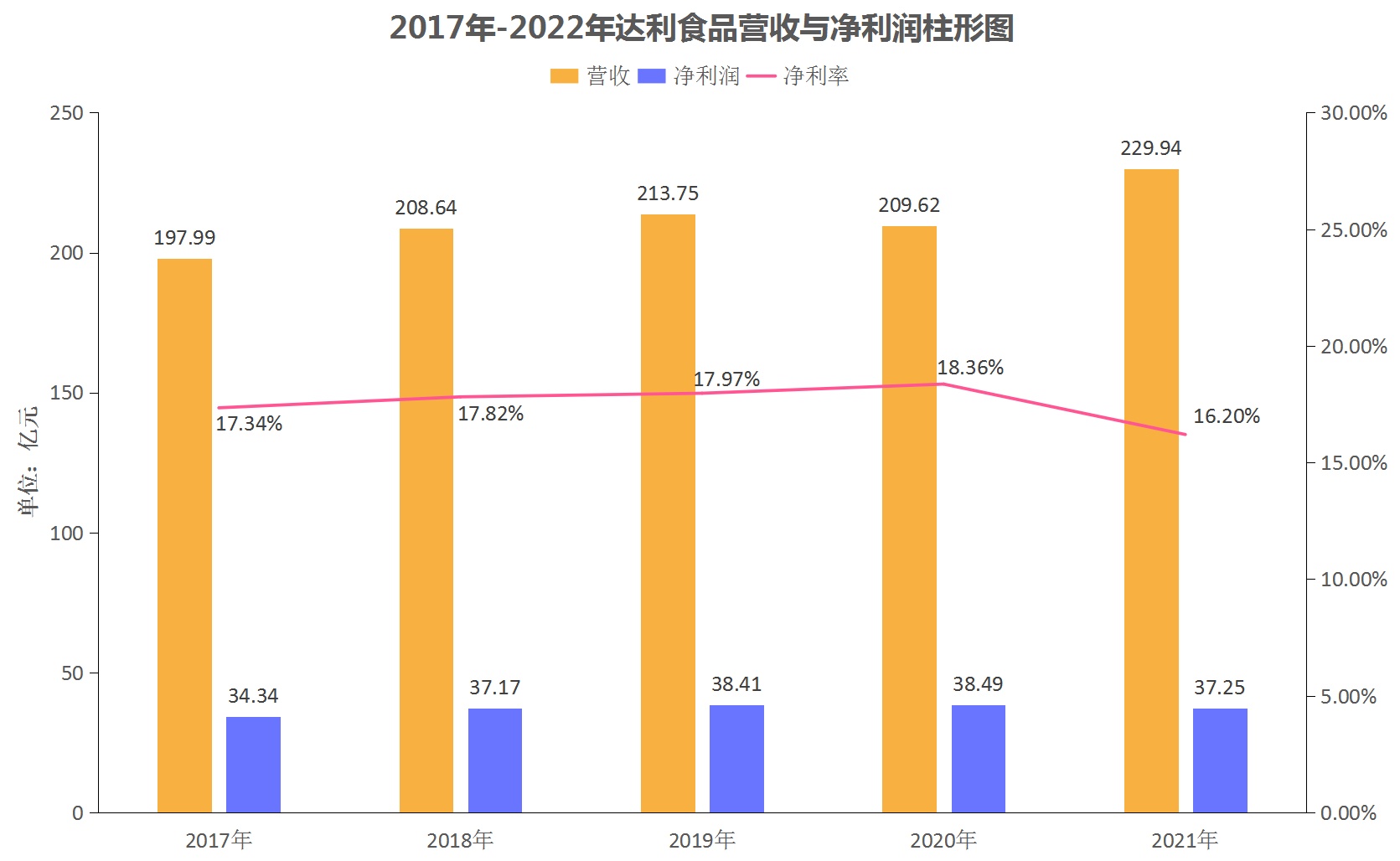 根据财报显示,公司在 2022 年上半年实现总营收 103.18 亿元,毛利润 36.37 亿元,净利润 17.06 亿元。按板块收入来看,家庭消费、休闲食品和即饮饮料三大板块分别录得 17.26 亿元、45.28 亿元、29.65 亿元。自 2018 年达利食品总营收冲到 200 亿大关之后,已经连续 4 年营收超过 200 亿,即使上半年疫情等宏观因素影响,达利食品 2022 年上半年营收也超过了 100 亿,毫无疑问,在外部环境不断转好的情况下,2022 年下半年的营收超过 100 亿应该是板上钉钉的事,也就是说 2022 年营收将会继续超过 200 亿!