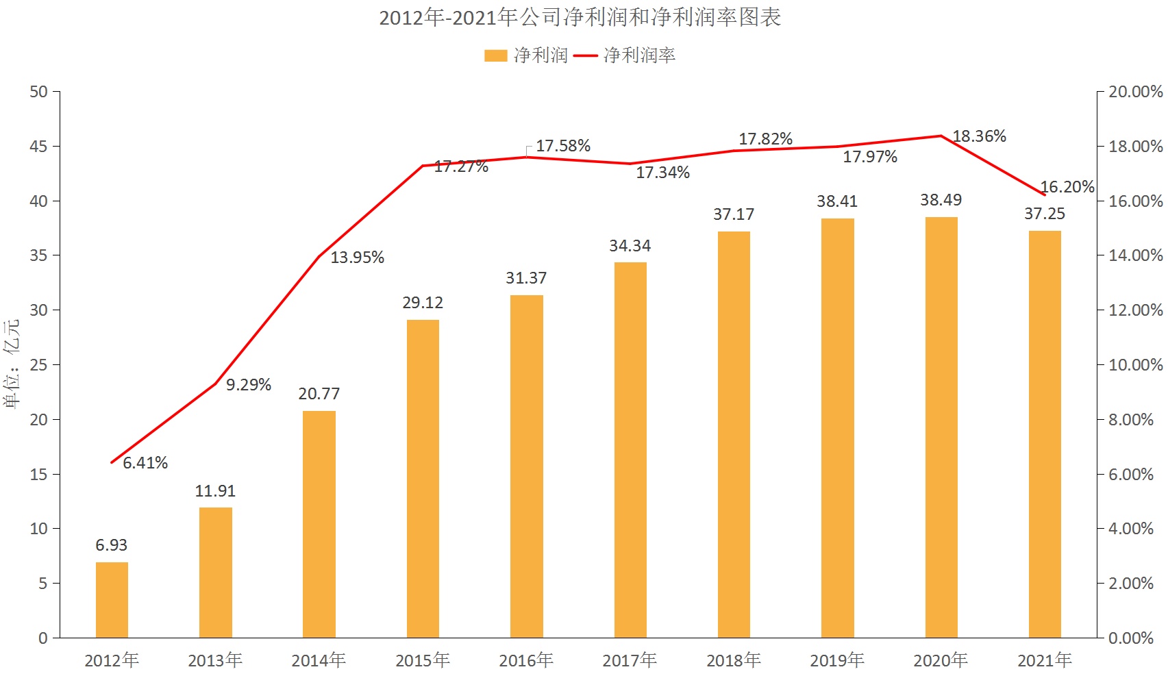 笔者将达利食品近 10 年的净利润和净利润率数据统计制作如下图表,公司净利润从 2012 年的 6.93 亿增至 2021 年的 37.25 亿,9 年时间净利润增长了 5.4 倍,复合年增长率为 20.55%,达利食品作为一家成熟的食品行业巨头,能保持这样的增长还是相当不易。目前公司市值 500 亿港元,市盈率为 12 倍,这在食品行业还是比较低的,投资价值正在显现。