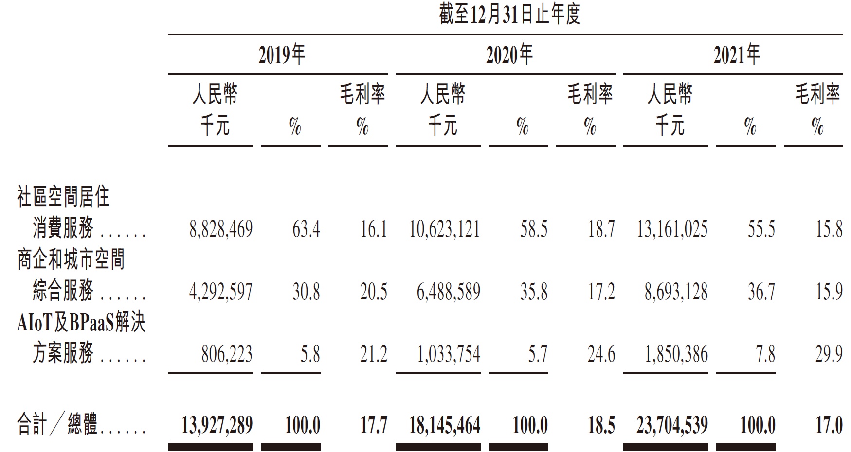 根据万物云招股书显示,公司目前主要提供三种不同类型服务,即社区空间居住消费服务、商企和城市空间综合服务、Alot 及 BPaaS 解决方案服务。其中社区空间居住消费服务在总营收占比占据主导地位,不过从 2019 年至 2021 年,其营收占比呈现逐年下降趋势,分别为 63.4%、58.5%、55.5%。而毛利率偏高的商企和城市空间综合服务、AIoT 及 BPaaS 解决方案服务在营收占比中开始逐年上升。