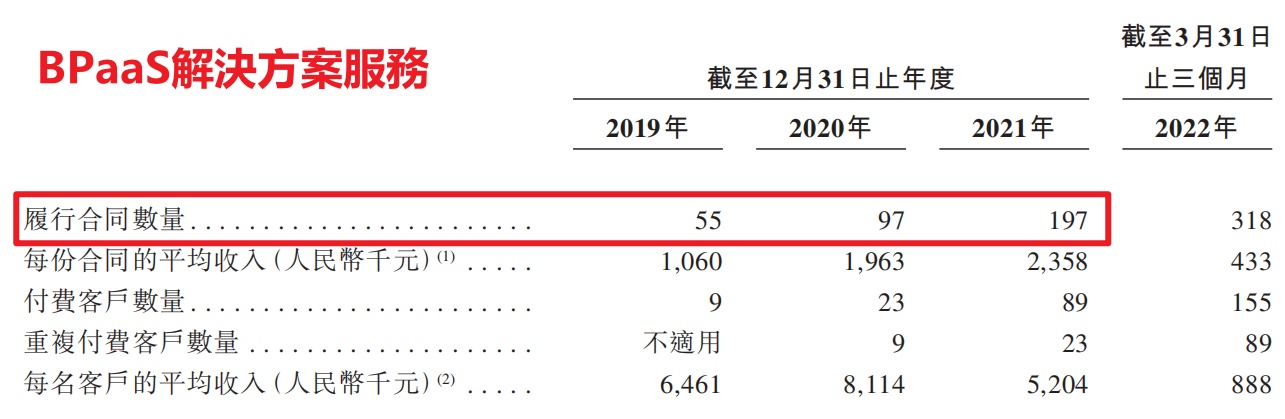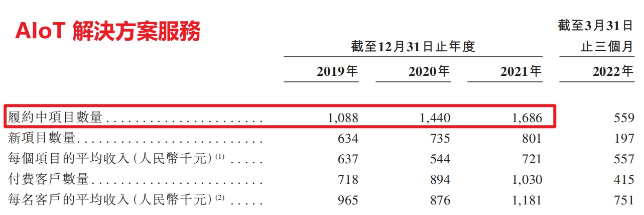 2019 年至 2021 年,AIoT 解决方案服务的履约中项目数量分别为 1088 个、1440 个、1686 个;BPaaS 解决方案服务的履约项目数量分别为 55 个、97 个、197 个,三年时间数量增长了 3.58 倍。