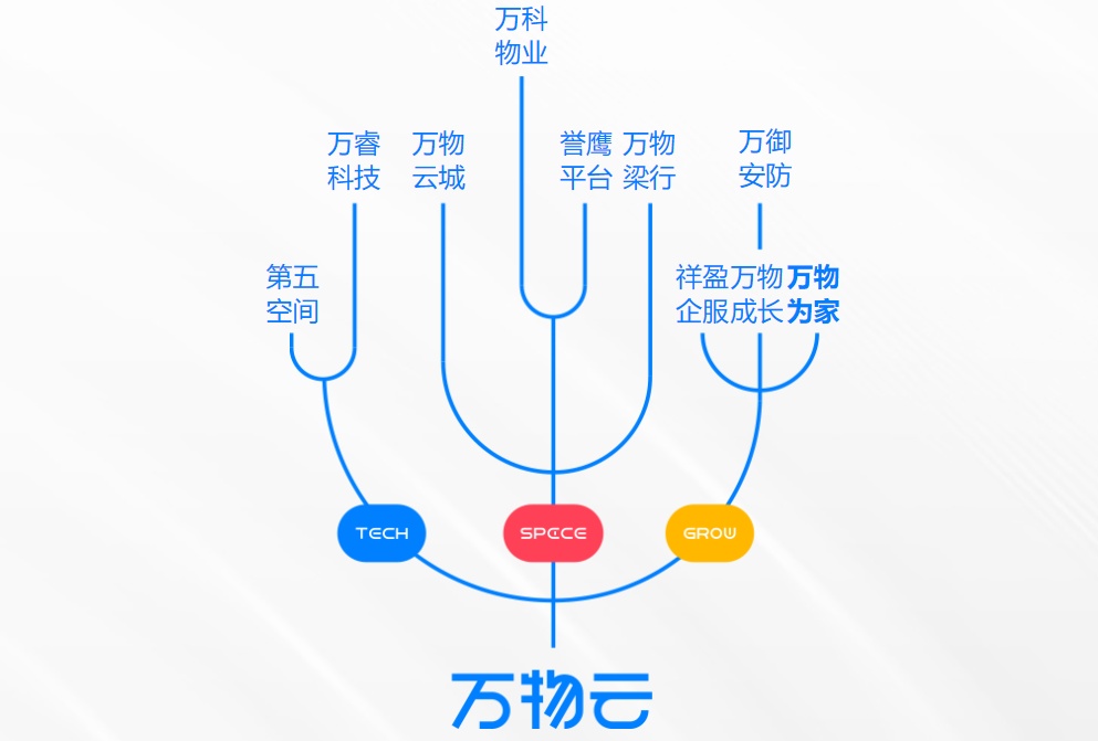 万物云已成为中国领先的全域空间服务提供商,也是独一无二的由社区、商企和城市空间三大业务体系协同驱动的空间科技服务商。已形成包括万科物业、万物梁行、万物云城、万睿科技、万物为家、祥盈企服等在内的丰富且系统化的自主品牌集群。