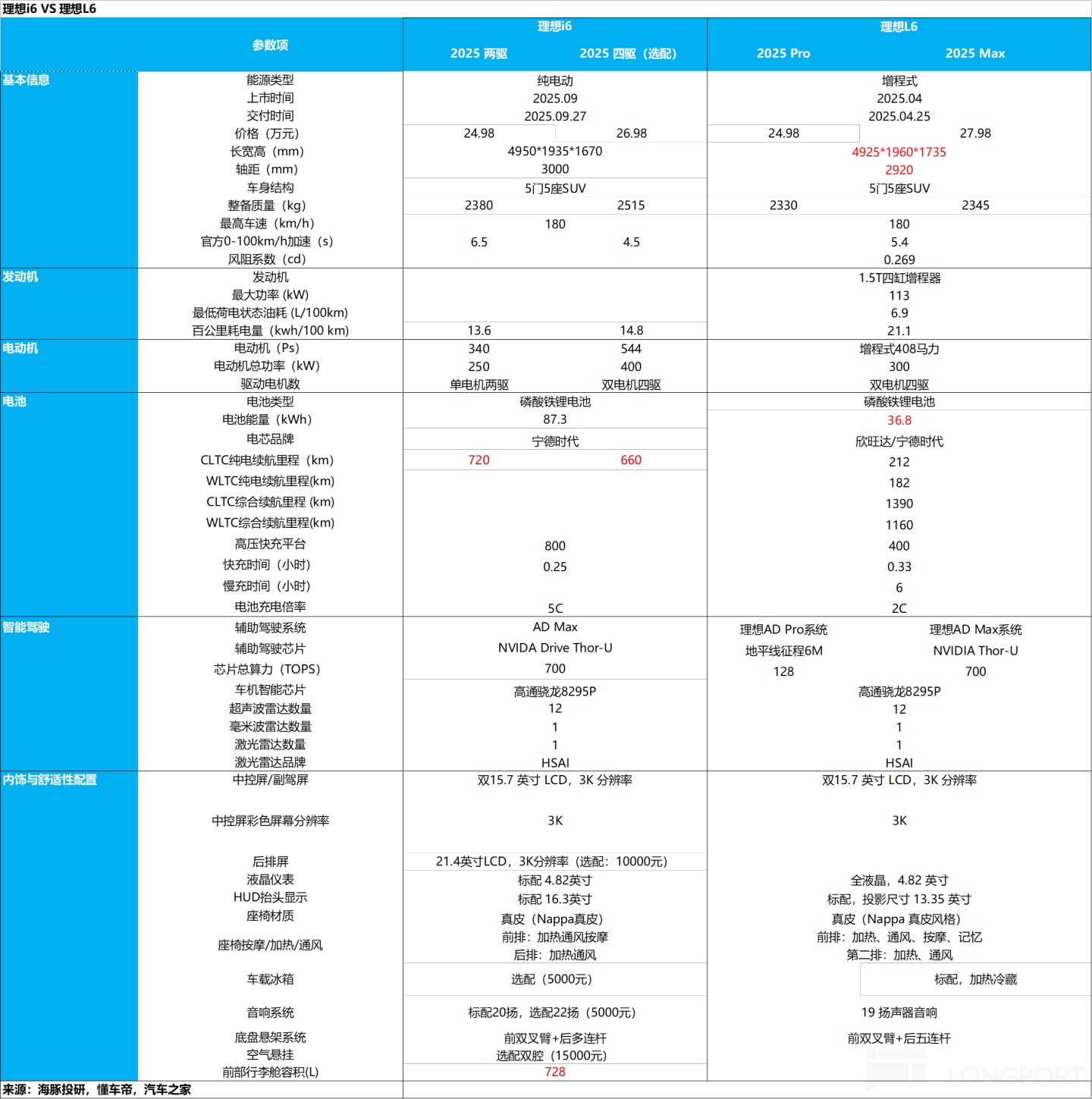 2)油电同价?电更便宜:$理想汽车-W(02015.HK) 之前推电车的时候,表达的是,就是给买L系列的车主们一个额外的动力选择,奉行油电同价的策略。理想i6官方定价确实定与增程车L6一样的价格——24.98万,来表达同一车型,多一动能选择的产品策略。