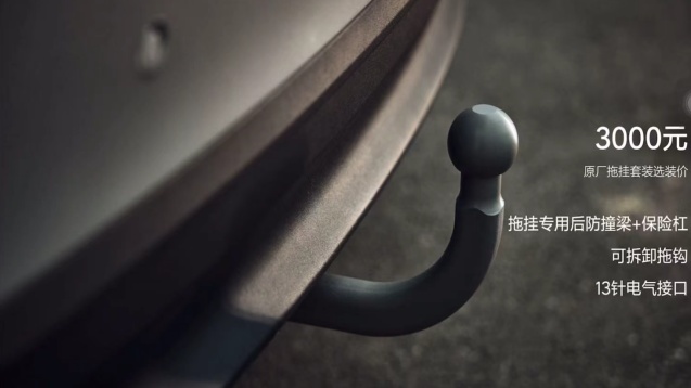 “移动车库”:具备完整的原厂拖挂资质,并提供包含强化后防撞梁和标准接口的拖车套装,选装的3000元,让用户轻松解锁拖挂房车或摩托车的乐趣。