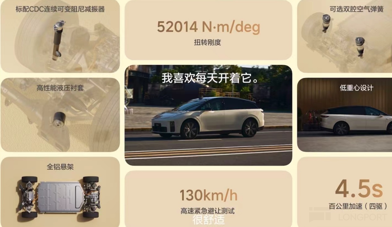 软件与调校:为减震器采用了与赛车相同的“大阻尼低压缩”调校方式,再配合理想全栈自研的智能电控底盘系统,最终实现了硬件与软件的最佳匹配,将各部件的潜力充分激发,共同造就了L6精准而稳定的操控性能。