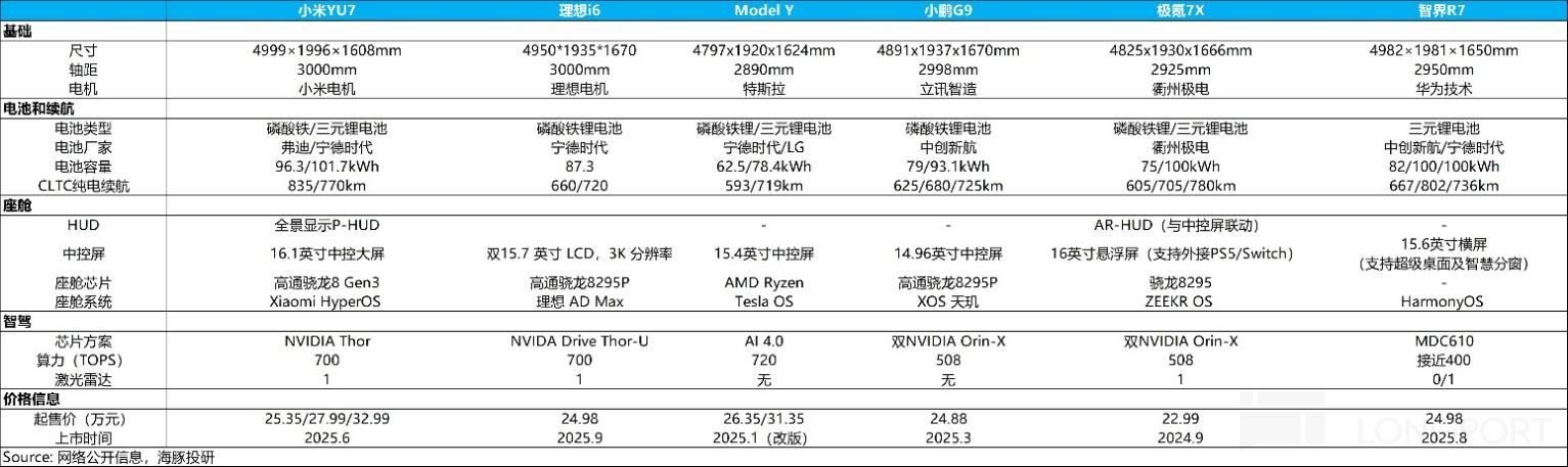20-30万的新能车SUV当中,Model Y和YU7分别排名第一和第二,单车销量在2-4万之间。理想i6相比这两款车,起步价更低,但标配宁德时代的i6电池续航更高,且现在理想已经建到了全国车企中最多数量的充电桩。再加上当下配置免费送和现金优惠,以及理想本身不错的智驾水准(相比L90减掉的智能驾驶硬件配置,和小米相对较弱的智能软件能力),其实就产品配置而言,吸引力是更强的。
