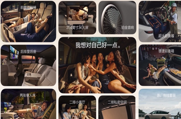 舒适:1)座椅采用了比迈巴赫S级还多一层的七层复合材料;2)提供副驾的“躺椅模式”可实现大角度躺卧,并独立调节头枕、颈枕,确保身体得到完美支撑;3)后排则可开启“皇后座模式”,配合隐私帘和长毛地毯,营造出专属的休憩天地。最具颠覆性的是“单人床模式”,它能一键将座椅变为两张无需额外床垫的平整单人床,并集成了座椅按摩和加热功能,甚至允许用户在躺姿下通过“老腰键”进行微调,将休憩体验推向极致。