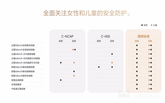 a. 乘员保护: 关注女性与儿童等不同身材的乘客,其内部安全标准覆盖了比行业标准假人更广的身高范围,进行了针对性的防护优化。