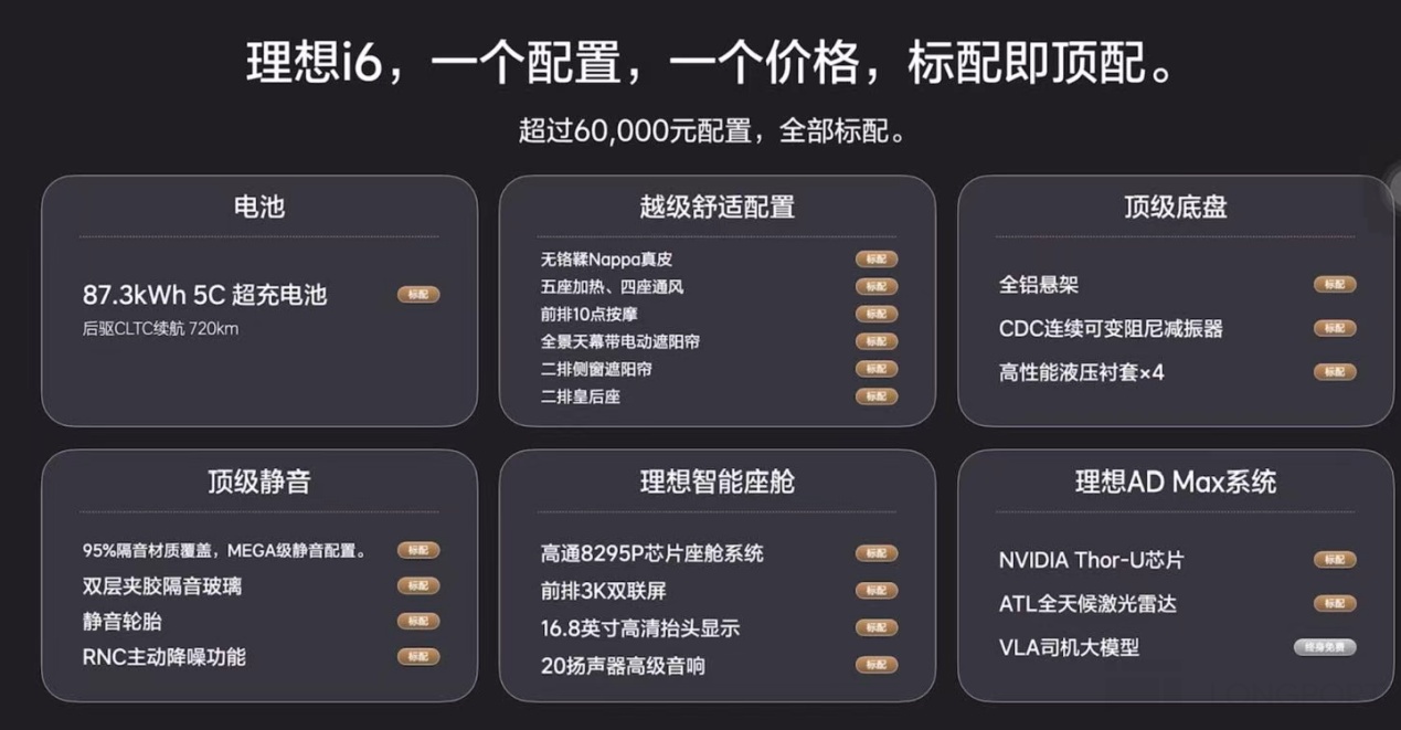 1) 单一爆品策略:i6不分Pro,Max版。高级版本的功能被做成了选配;比如四驱在i6是选配功能、彩电是选配、冰箱是选配。但电池上,全系标配宁德时代铁锂电池、800伏高压快充、智能硬件上英伟达Thor-U芯片、一颗禾赛激光雷达。