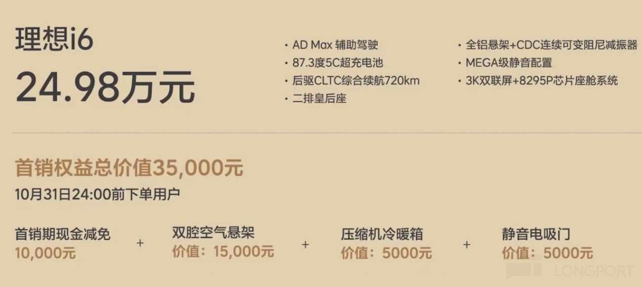 b. i6虽然高阶功能看似是选配,但当下阶段下订单,价值五千的冰箱是免费送、原高阶版本才有的双腔空悬免费送(价值1.5万)、价值五千的电吸门也是送。在三送的基础上,再现金免费1万块钱(这一万块钱相当于加配一个后排大彩电的价值)。
