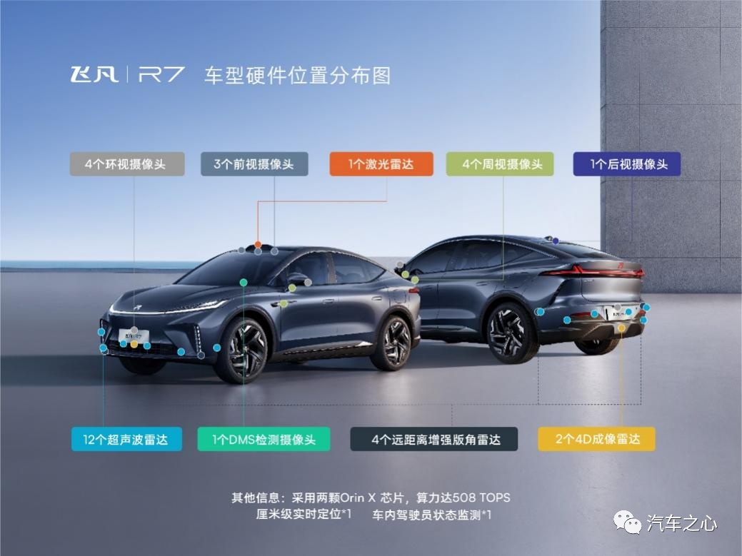 说有「看点」,是因为飞凡 R7 把各种感知硬件都尽可能的拉满,全车最高 33 个感知硬件,这几乎是目前智能电动汽车硬件配置的天花板。