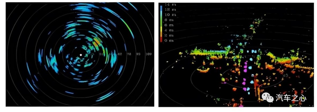 传统毫米波雷达点云(左)和 4D 毫米波雷达点云(右)