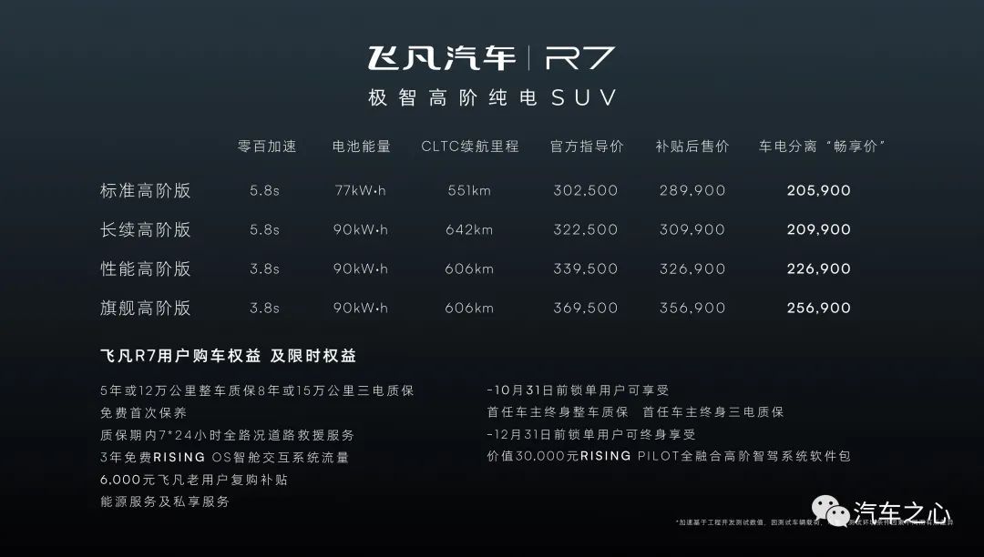 飞凡 R7 补贴后售价、用户购车权益如下:
