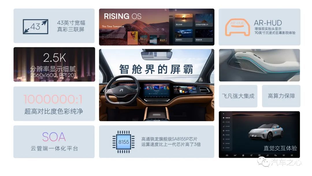 上市之前,飞凡 R7 其实已经给外界留下不少的初印象,比如国内首发 4D 成像雷达、惹眼的 43 英寸三联屏,可以投影的华为视觉增强 AR-HUD,以及可以实现 RISING PILOT 全融合高阶智能驾驶系统等功能。