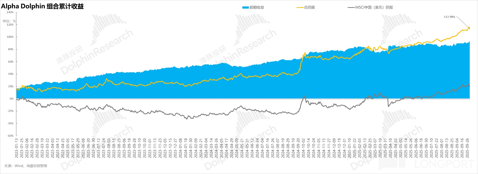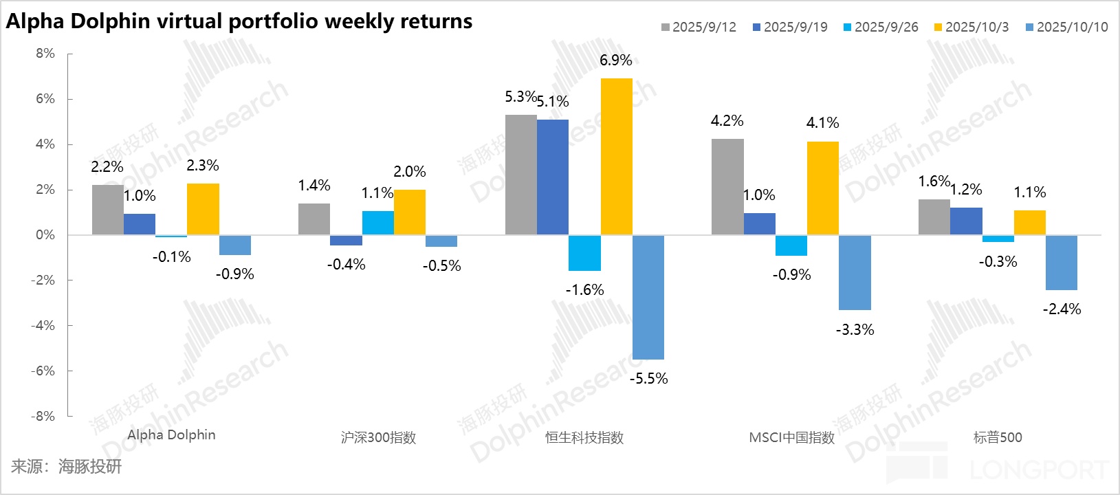 上周,海豚投研的虚拟组合 Alpha Dolphin 未调仓。当周下行 1%,跑输沪深 300(-0.5%),主要因 A 股国庆不开盘。但跑赢 MSCI 中国指数(-3.3%)、恒生科技指数(-5.5%)、标普 500 指数(-2.4%)。