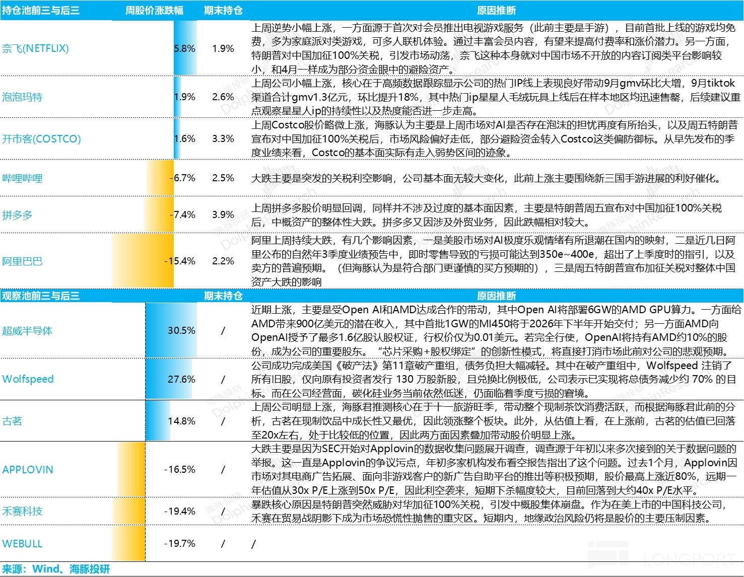 上周海豚君的虚拟组合 Alpha Dolphin 下跌主要因特朗普威胁要再对中国加 100% 的关税之后,全市场普遍回调,中概资产,和半导体资产都有不小的下跌。但持仓中的黄金有一定对冲效果。