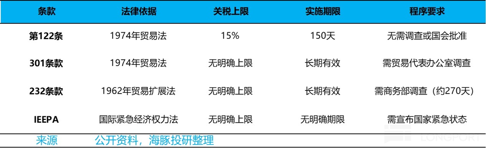 从目前情况来看,市场预期特朗普败诉可能性较高,纠结点更多是退税额度、替代工具使用是否受限问题。而特朗普政府后续很可能用会用第 122 条来延期,但该条款税率上限有限制,不如 301、232 等的税率有震慑力,因此用 122 条款来延期,给 301 和 232 条款所需要的机构调查来做缓冲。