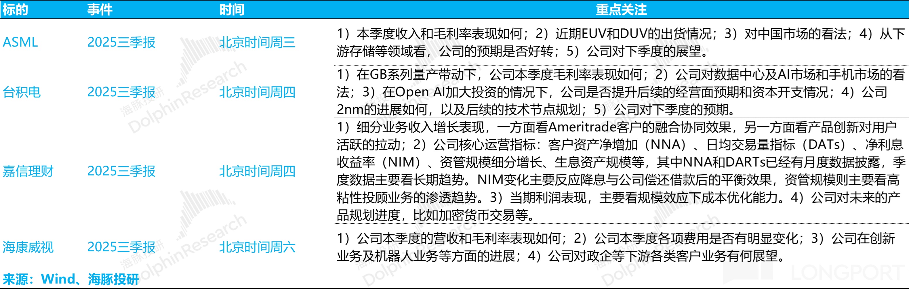 从本周开始,美股半导体开始进入财报季,ASML 和台积电打头,需要注意这两家中上游公司对产业链,包括传统半导体的逻辑辐射,从电话会和指引中寻找传统半导体是否回暖,或者何时回暖的信号。